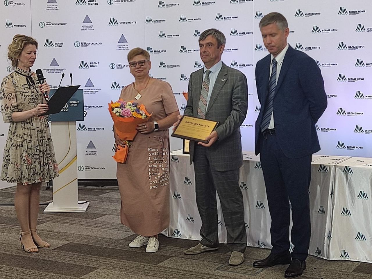 В завершении сессии и, впервые на «Белых ночах», состоялась церемония награждения пациентских организаций и благотворительных фондов, которые активно сотрудничают с онкологическими учреждениями, помогая пациентам. Представителям этих организаций были вручены благодарности от НМИЦ онкологии им. Н.Н. Петрова. Их вручали заместитель директора Центра, д.м.н. Сергей Багненко, заведующая детским отделением, д.м.н. Светлана Кулева и руководитель информационно-сервисной службы Анна Малкова.