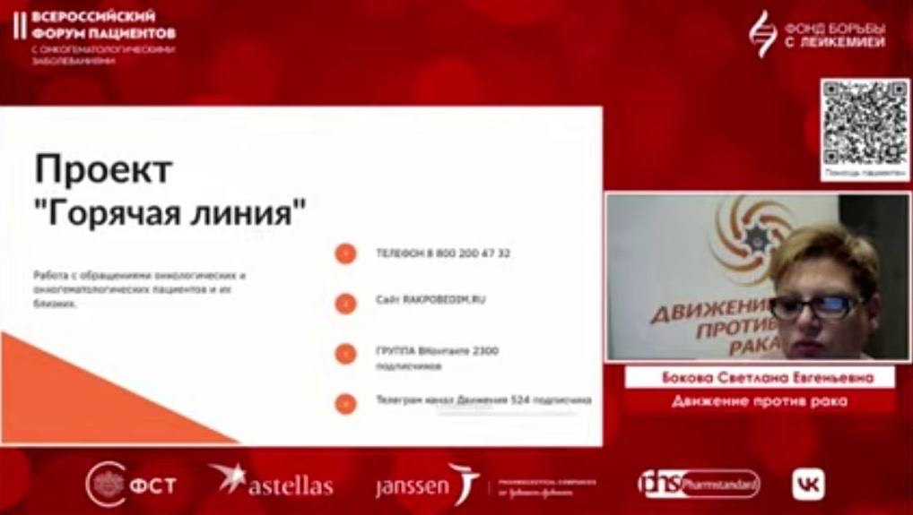Также Светлана Евгеньевна отметила, что «Движение против рака» активно взаимодействует и с органами власти, контролирующими органами и медицинским сообществом абсолютно на всех уровнях, от Правительства РФ до профильных медицинских учреждений, чтобы пациенты могли не только получить помощь в максимально короткие сроки, но и быть обязательно услышанными.