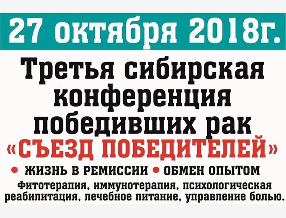 Друзья, приглашаем вас на III Сибирскую конференцию победивших рак «Съезд победителей». В ней примут участие пациенты и врачи из разных регионов Сибири и европейской части России. Вы сможете узнать важную информацию о своём здоровье, которая поможет справиться с заболеванием или предотвратить его.