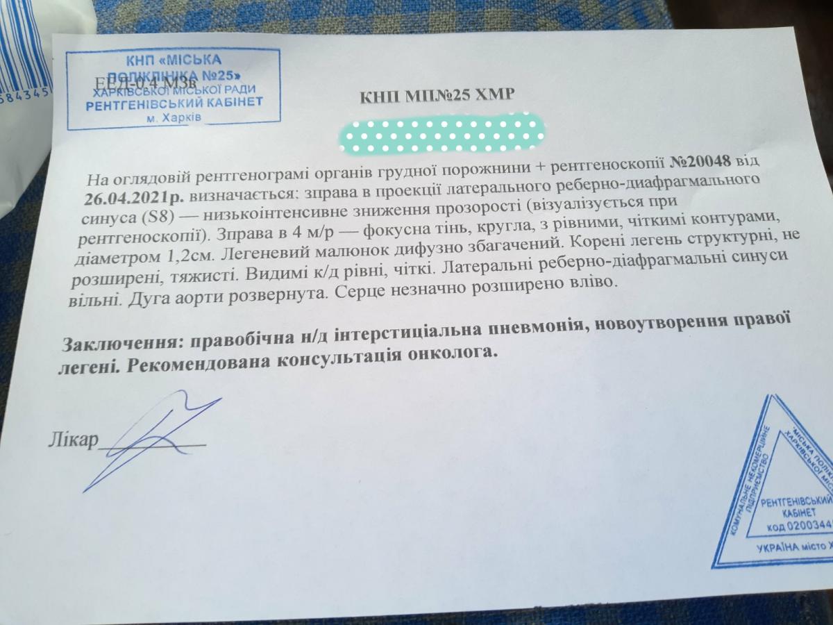 Здравствуйте. Заранее буду благодарна всем откликнувшимся! Две недели назад папа заболел коронавирусом. Сделали рентген. Рентген показал одностороннее воспаление легких с одной стороны, с другой стороны, на рентгене выявили фокусную круглую тень. Сейчас направляют к онкологу на консультацию. Пока мы не можем еще туда поехать, к сожалению, т.к. коронавирус не долечен. Очень переживаю и надеюсь, что это ошибка, выкладываю сюда снимок легких и заключение, сделанное рентгенологом. Пожалуйста, посмотрите и напишите мне, что там. Буду очень благодарна за ответы!Спасибо.