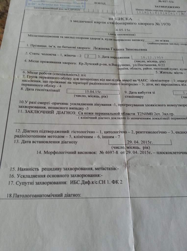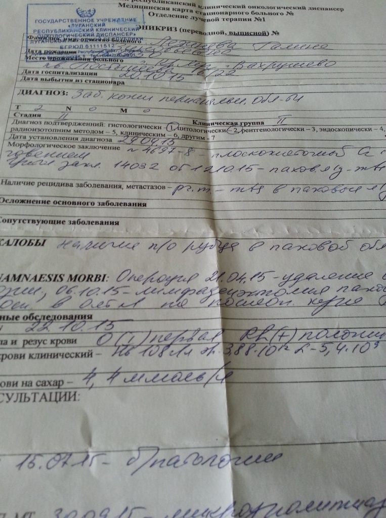 Здравствуйте, прошу помощи расшифровать диагноз, советом, опытом, лечением и всем чем могли бы мне помочь. История у моей мамы такая, в апреле 2015 года удалили опухоль на интимном месте, Диагноз T2N0M0 рак кожи перианальной области с ороговением. В октябре 2015 года обнаружили паховый лимфоузел с метастазами- удалили, назначили лучевую терапию. Сейчас в апреле 2016 года, удалили еще один лимфоузел с метастазами, лучевую терапию не назначили, так как просло с момента лучевой терапии меньше года, а химиотерапия не показана. Получается каждые полгода ее режут. Подскажите люди добрые, что нам делать? Какие исследования пройти, чем лечить?