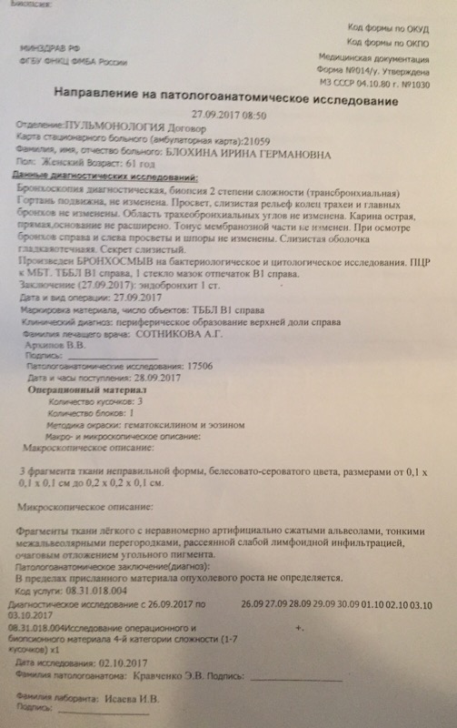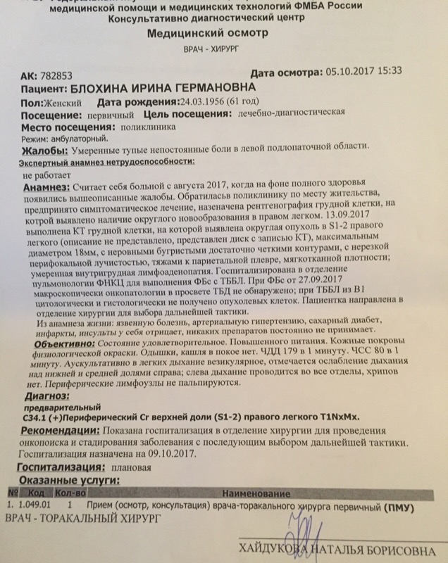 Добрый день! Моей маме очень долго не могли поставить диагноз - сначала воспаление лёгких, потом туберкулёз. После биопсии опухоли в легком, сказали, что раковых клеток не обнаружено. На следующий день хирург, посмотрев КТ, сказал, что это точно рак, несмотря на отсутсвие раковых клеток по результатам биопсии. (У меня нет анамнеза и результатов анализов на руках, я рассказываю, что знаю по словам мамы.) Хирург сказал, что опухоль в лёгком может быть последствием опухоли 4 стадии в каком-то другом органе. Так действительно бывает? В понедельник мама ложится на полное обследование. Нам не хочется верить в негативные прогнозы. Скажите, пожалуйста, у кого-то был опыт подобного? Мы пока в растерянности и не знаем, что делать. UPD прикрепляю анамнез UPD операцию, лобэктомию, провели. Это была первичная опухоль, метастаз она не дала.