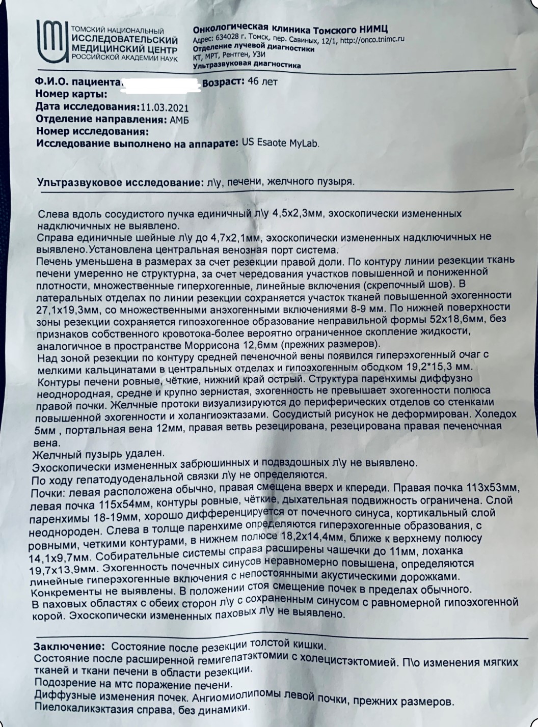 Улисс Опубликовано 11 марта, 2021 Жалоба Опубликовано 11 марта, 2021 Добрый день всем! Очень нужен совет и рекоммендация по дальнейшей тактике лечения при рецидиве рака прямой кишки. Изначальный прогноз pT4aN2aM1aG2Ro IV ст. метастазы в правую долю печени, был поставлен в декабре 2019 г. 14 января 2020 была проведена резекция прямой кишки, после чего проведены 9 курсов ПХТ по схеме XELOX, бевазицумаб. Была достигнута стабилизация очагов в печени, после чего 16.09 была проведена расширенная гемигепатэктомия правой доли печени. После проведенного лечения 2 контрольных обследования в декабре и феврале проведены успешно (МСКТ брюшной полости с контрастированием, КТ грудной клетки, УЗИ брюшной полости, печени, онкомаркеры: РЭА, СА 19-9), но 11.03.21 в рамках проведения УЗИ печени было выявлено новое образование по линии резекции печени (МТС), скан УЗИ прикладываю. Сейчас нахожусь в растерянности, пока непонятно какие тактики в настоящее время возможны и стоит рассматривать. Буду благодарна любой рекомендации и совету. Цитата
