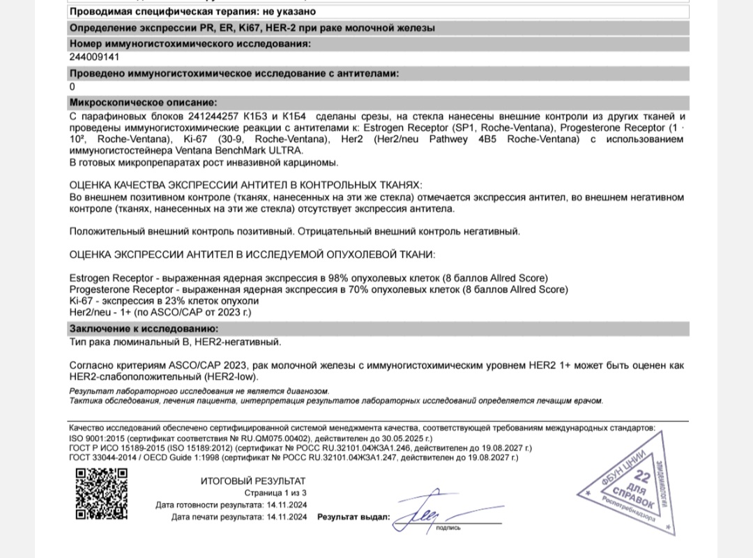 Юляшка77 Опубликовано 14 ноября, 2024 Жалоба Опубликовано 14 ноября, 2024 Всем здравствуйте и всем конечно же скорейшего выздоровления. Обнвружила уплотнение в молочной железе, узи,маммография, все говорило за онко,а сейчас и биопсия пришла....шок,неверие,хотя я уже после врача понимала, что это скорее всего оно(((.Я из Московской области, куда бежать в Москве, какие врачи лучше. По омс пока не хочу,все очень долго и муторно. И вообще, поддержите словом, советом, хреново так(((.И сейчас прикреплю результаты биопсии, подскажите, на сколько все плохо. Спасибо всем заранее. Цитата