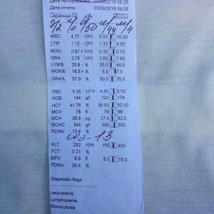 Татьяна 77 Опубликовано 4 сентября, 2016 Жалоба Опубликовано 4 сентября, 2016 Здравствуйте, уважаемые специалисты! Помогите пожалуйста! Женщина, 39 лет, с сентября 2015 года субфебрильная температура 37, 37.2 , в жару доходит до 37.4, на ночь спадает. На антибиотики и жаропонижающие темп. не реагирует. Постоянная слабость, быстрая утомляемость, спина побаливает, краснота и жар в лице (волчанку исключили). Прошла всех специалистов, много обследований, ВИЧ, гепатиты, диаскин тест, ана-скрин,срб, рф - отриц, УЗИ всех органов, МРТ головного мозга, кт легких, фгдс, колоноск, ирригоскоп. В клиническ. анализах крови в общем подсчете моноциты в % отношении всегда выше нормы, иногда сдвиги лейкоформулы влево. Была у местного гематолога, делали стернальную пункцию, гематолог сказала заболеваний крови нет. От инфекциониста сдавала кровь на инфекции, выявили повышение anti-Borrelia byrgdorferi lgM, но клещ не кусал, и иммуноблот отрицательный (а блот исключает боррелиоз)в . Инфекционист понять не может почему так, говорит может это перекрестные значения с чем то, а с чем никто не знает. В первом анализе крови соэ был 48, когда заметила температуру, на тот момент я болела банальной простудой, поправилась, а темп осталась. Сейчас все симптомы сохраняются, постоянная слабость, температура. Не может ли это быть началом заболеваний крови? (прочитала про моноцитарный лейкоз). Подскажите пожалуйста, хочу пройти ПЭТ КТ, как дополнительное обследование, так как не знаю к кому еще обратиться. Спасибо! Владимин1985 1 Цитата