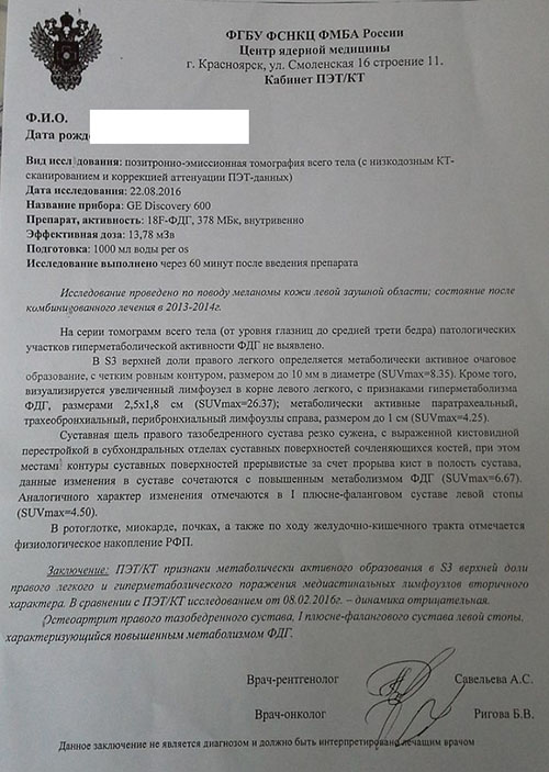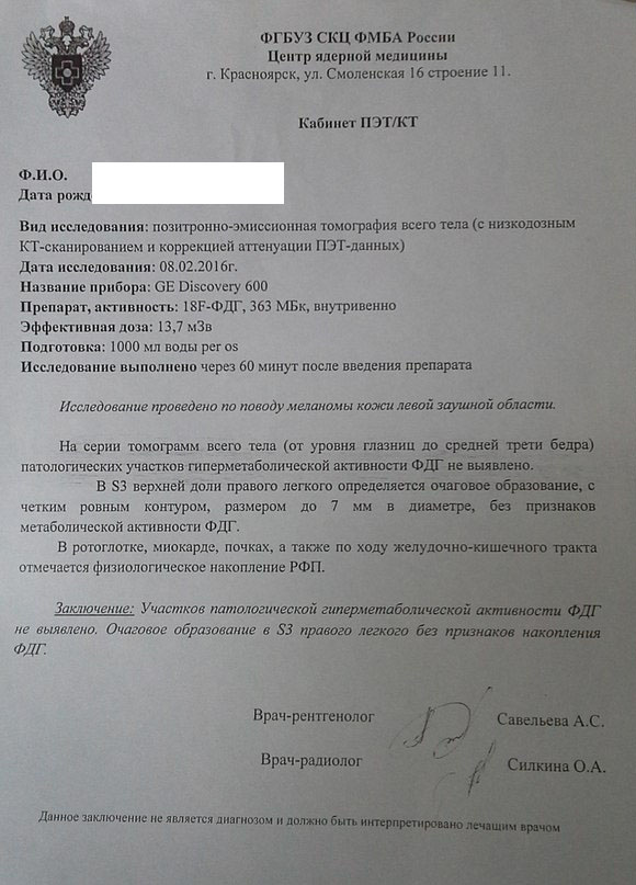 Ирина Шалыгина Опубликовано 2 сентября, 2016 Жалоба Опубликовано 2 сентября, 2016 Добрый день, уважаемые специалисты!Очень хотелось бы услышать Ваше мнение о результатах ПЭТ КТ.Ситуация следующая: мой отец, 53 года, в феврале 2013 перенес операцию по удалению меланомы заушной области слева, в августе 2013 удаление шейных лимфоузлов. Регулярно проходит обследования (МРТ, СКТ, УЗИ). В ноябре прошлого года в легких был обнаружен очаг, в декабре на консультации в НИИ Онкологии Томска была дана рекомендация пройти ПЭТ КТ в Красноярске. ПЭТ КТ активности очага не показало. В июле этого года на КТ с болюсным контрастированием - отрицательная динамика. На ПЭТ КТ в августе этого года появилась метаболическая активность этого очага и увеличение лимфоузлов.В НИИ онкологии Томска естественно говорят, что при таком диагнозе первым предположением могут быть только метастазы меланомы. Но уверенности у них нет. Может быть в Вашей практике были подобные случаи, что это может быть? Почему очаг сначала был неактивен, а затем активность появилась? По месту работы отца были случаи туберкулеза, может ли это быть туберкулез?Сканы заключений прилагаю, изображения к сожалению приложить не могу, они в виде приложений записаны на дисках. Цитата