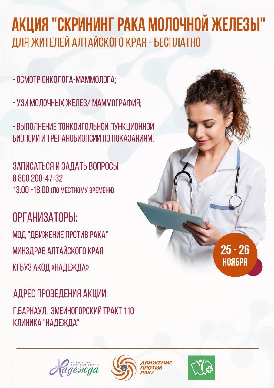 Дорогие друзья! Акция «Скрининг рака молочной железы» продолжается, и на этот раз мы отправляемся в Алтайский край. Именно здесь, в городе Барнауле 25 и 26 ноября пройдет наша программа по ранней диагностике рака молочной железы для всех желающих.