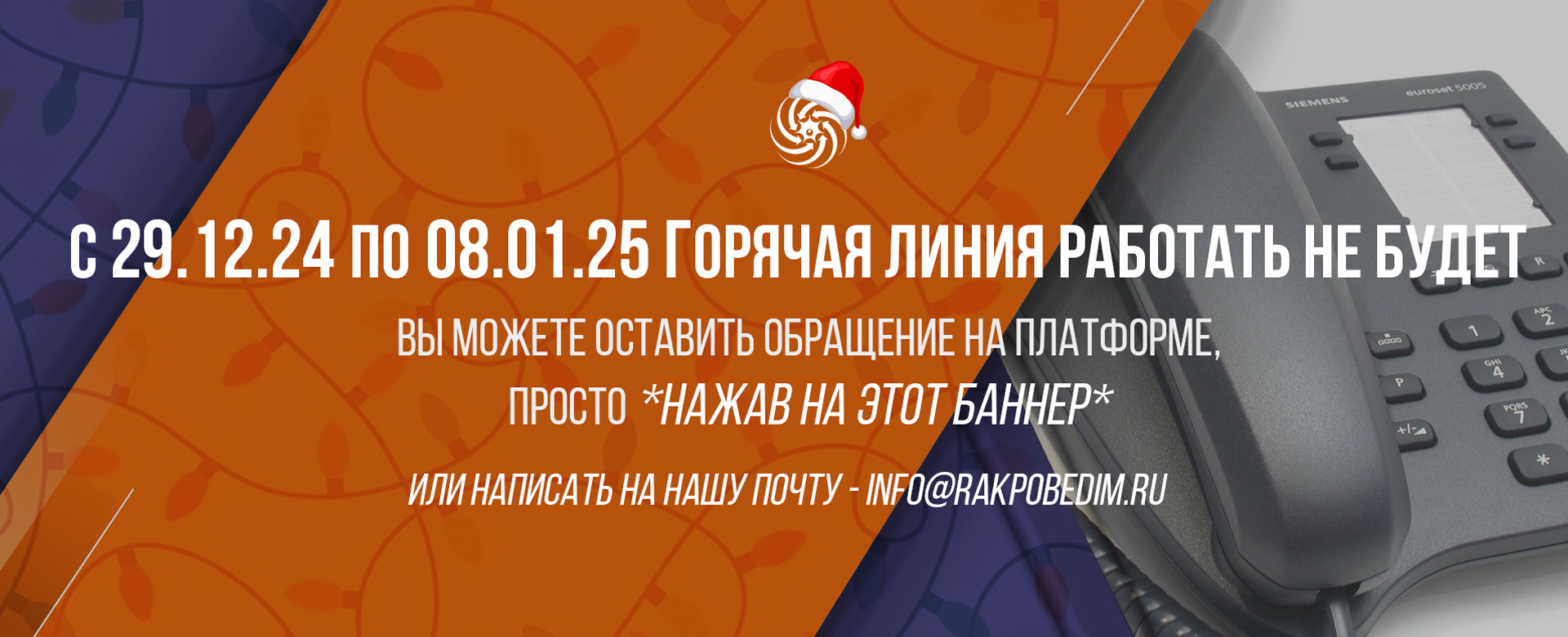 Друзья, с 29 декабря 2024 г. по 8 января 2025 г. включительно телефон нашей Горячей линии "уходит" на каникулы.