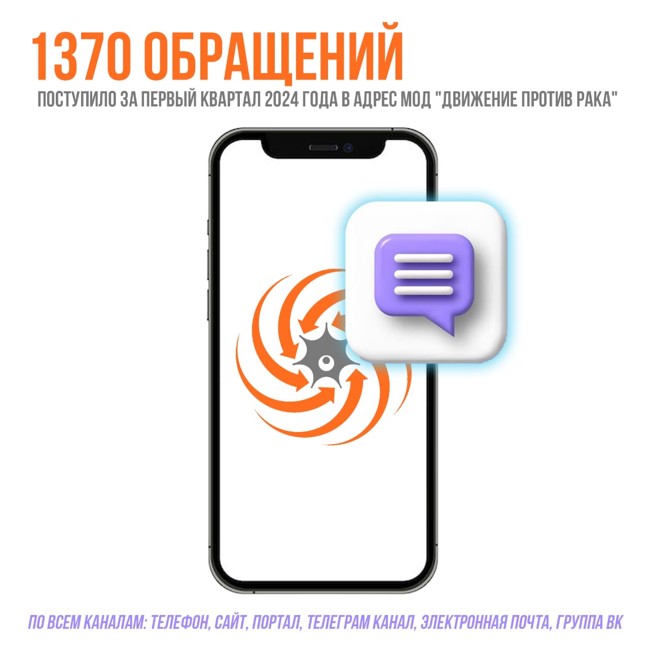 Специально для вас создана наша «Горячая линия», где наши специалисты работают с обращениями онкологических и онкогематологических пациентов и их близких. Только за первый квартал 2024 год в адрес нашего Движения поступило 1370 обращений по самым разным тематикам: лекарственное обеспечение, информационные и юридические вопросы, психологическая помощь, медицинские вопросы, проблемы организации.