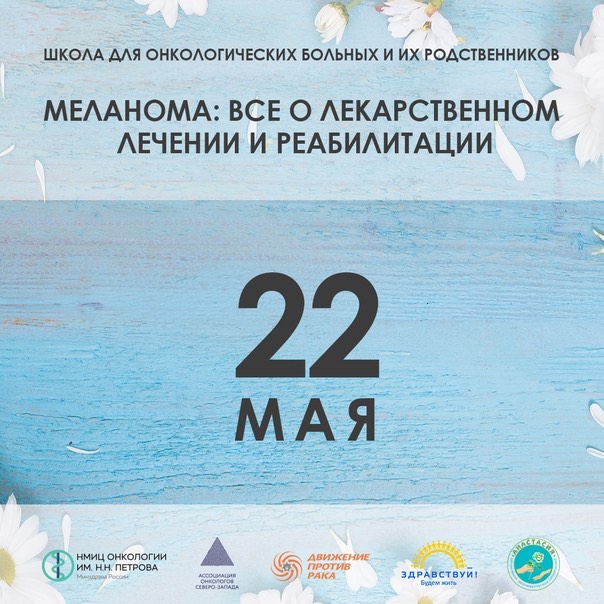 Дорогие друзья! 22 мая 2024 года мы вновь проводим Школу пациентов в очном и он-лайн формате. Встреча посвящена лекарственному лечению меланомы и реабилитации и пройдет на базе НМИЦ онкологии им Н.Н. Петрова по адресу: г. Санкт-Петербург, пос. Песочный, ул. Ленинградская, д.68