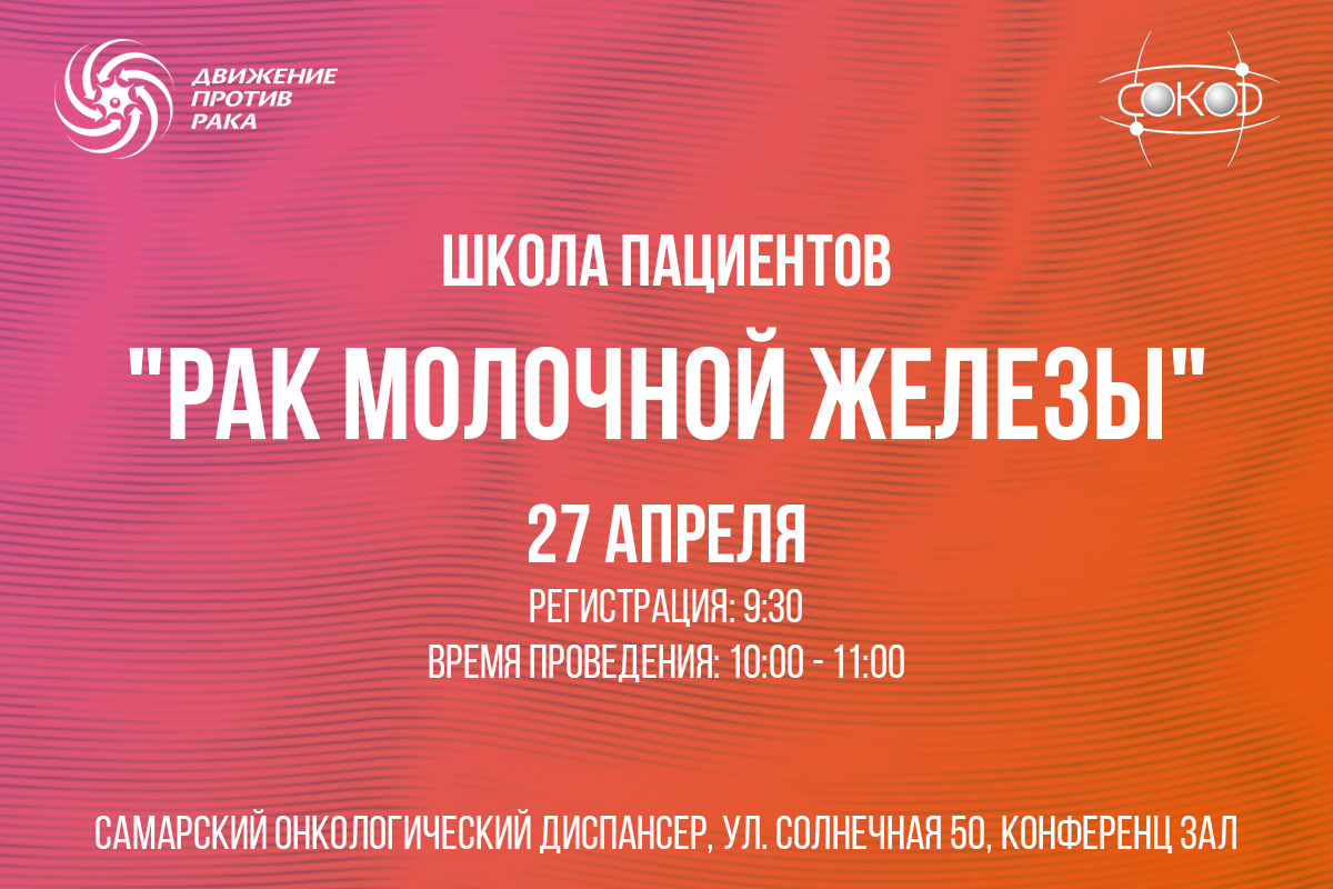 Друзья, рады сообщить вам, что уже в эту субботу 27 апреля МОД "Движение против рака" проводит Школу пациентов на базе Самарского онкологического диспансера (ГБУЗ СОКОД). Тема Школы "Рак молочной железы". Будем говорить о: профилактике и реабилитации после радикальной мастэктомии и лекарственном обеспечении пациентов с РМЖ.