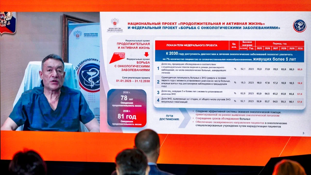 Ключевым событием второго дня стало и выступление генерального директора НМИЦ радиологии Минздрава России, главного онколога Минздрава России, академика РАН Андрея Дмитриевича Каприна. Его доклад стал масштабным обзором состояния онкологической службы страны: от модернизации инфраструктуры и внедрения инновационных технологий до реальных показателей доступности лечения. Отдельно он ответил на вопросы о разработках в сфере онковакцин - тема, которая сегодня вызывает большой общественный интерес.